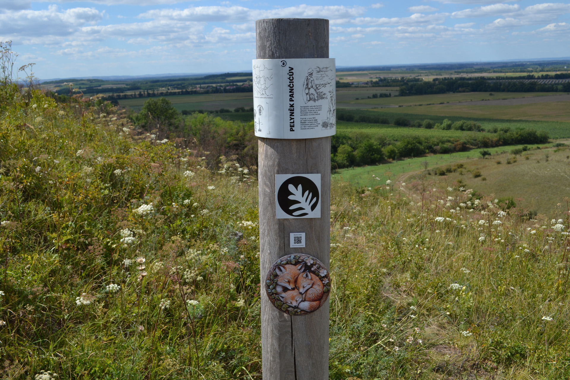 A proč Liščí? Protože jsou tam lišky? Já vlastně nevím. Nepodařilo se mi to dohledat, každopádně oblast je chráněna pro velký výskyt vzácných stepních biotopů, jako je mandloň nízká, pelyněk Pančičův nebo také ohrožená kudlanka nábožná. Na vrcholu jsou k vidění různobarevné kytičky a triangulační tyče.