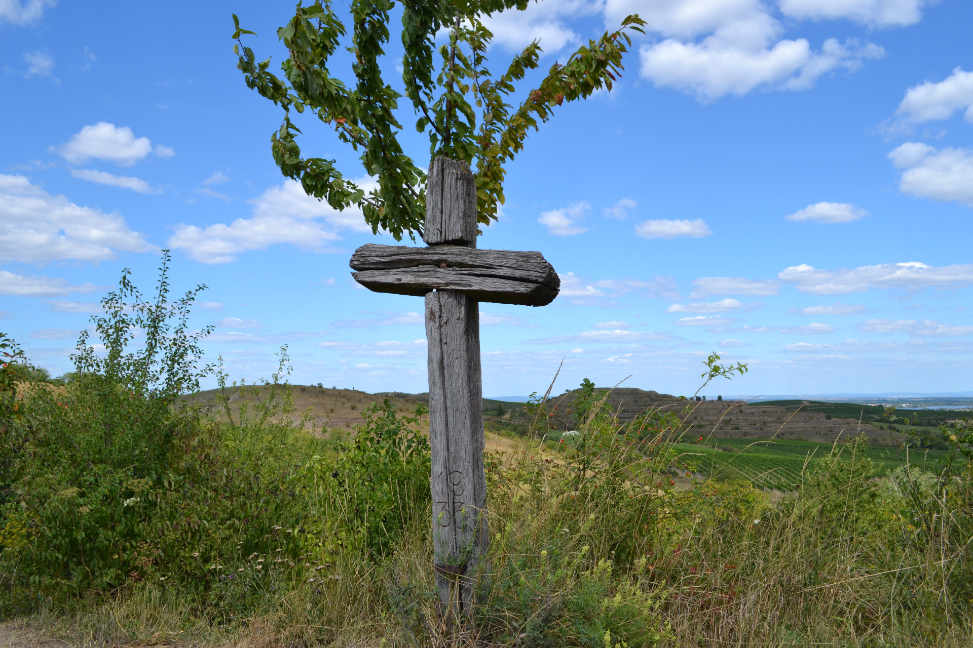 Hned za bránou jsem narazila na rozcestí, které hlídá dřevěný kříž s letopočtem 1933. Věnovala jsem poslední pohled hlavní dominantě Dunajovických kopců a obrátila jsem své kroky k Mikulovu.