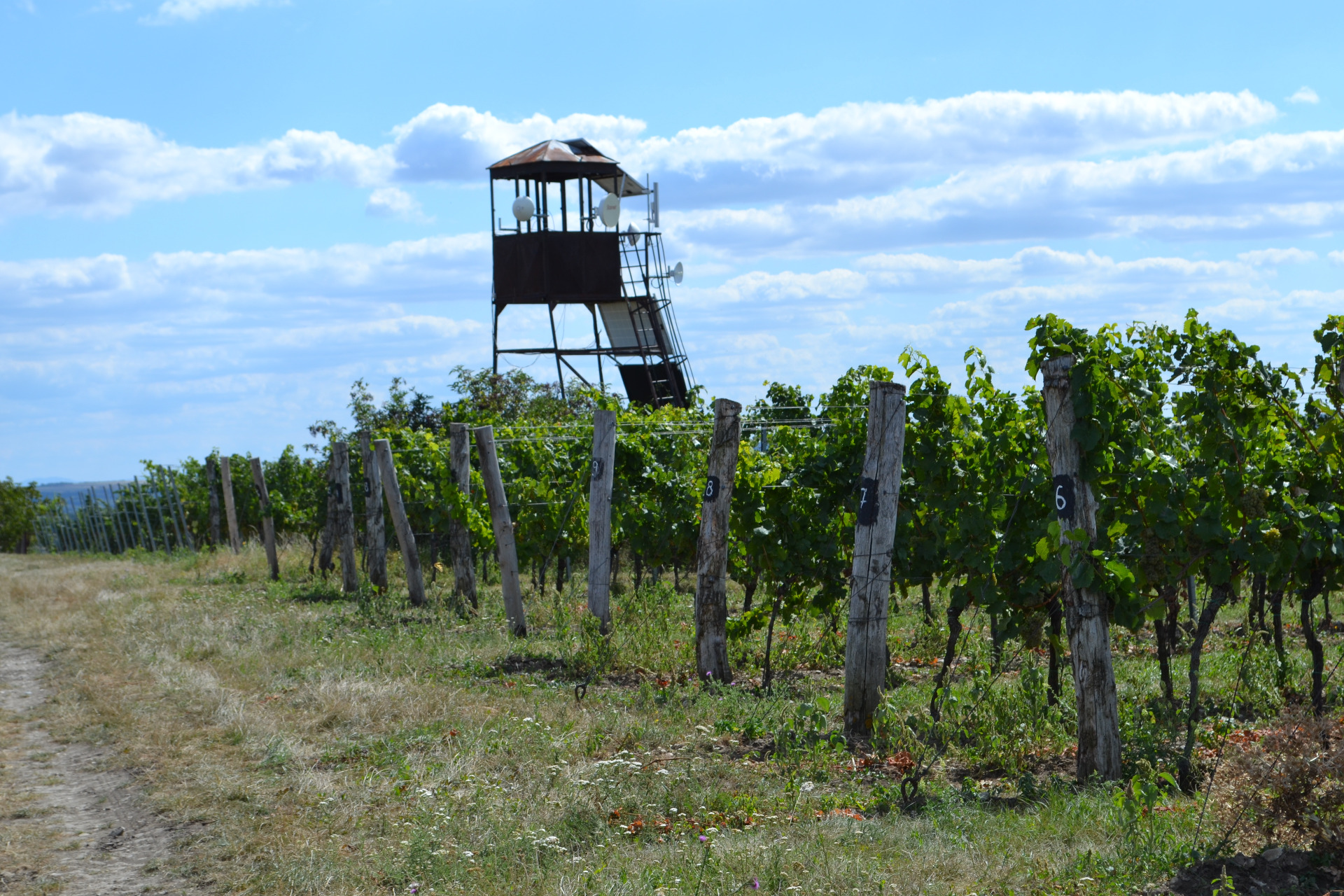 První kopec, který jsem chtěla zdolat, byla Malá Slunečná. Vzala jsem to tedy nejkratší cestou přes Povidlovou alej, kde jsou vysázeny ovocné stromy. Potkala jsem pár cyklistů na elektrokolech, jinak nikde ani živáčka. Sluníčko už začalo pálit, tak jsem využila místní altánek na odložení nepotřebných svršků. Dala jsem si svačinu a začala jsem stoupat podél vinice k vysílači, který symbolizoval vrchol Malé Slunečné.