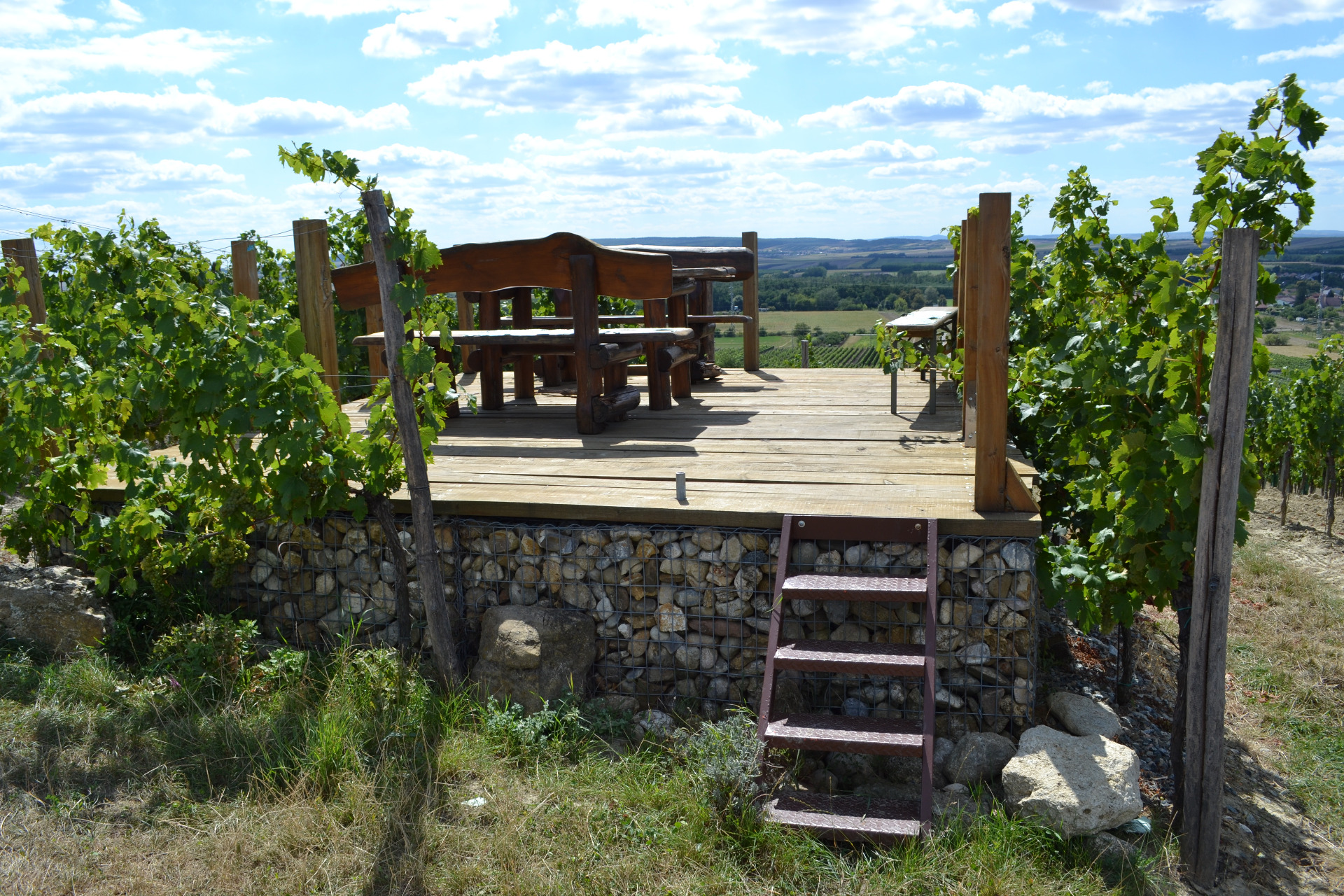 Po srdceryvném loučení s oslíky jsem se vydala na Růžovou horu. Je to odpočinkové místo s lavičkou, odkud jdou krásně vidět terásky Velké Slunečné. Těšila jsem se, že si tady udělám ikonickou fotku s výhledem na Dunajvické kopce a taky jsem už začínala mít hlad. Sezení by k jídlu bodlo. Takže tradá podél vinic zase o kus dál.